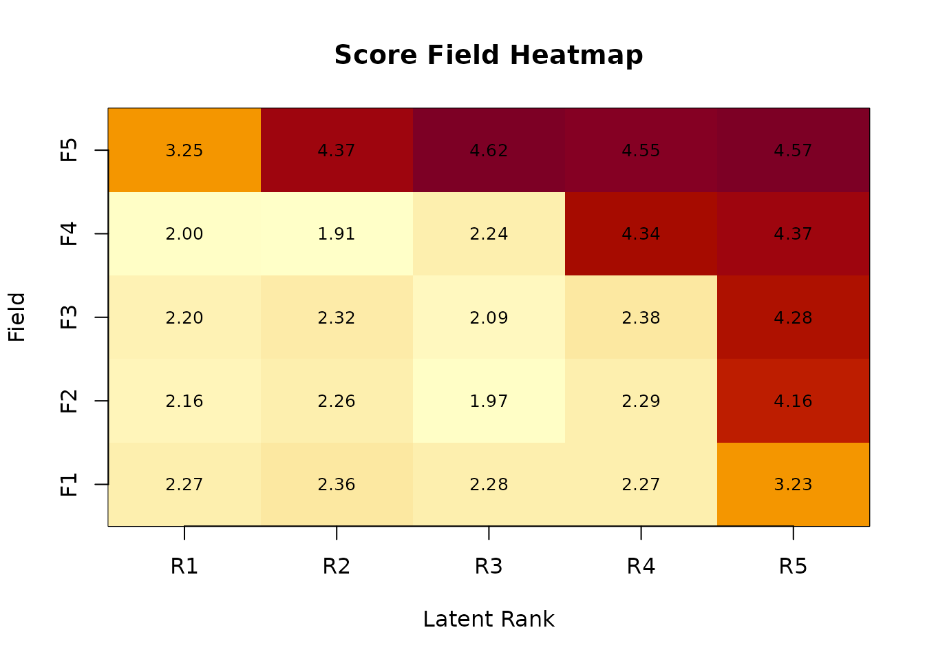 FRP (Field Reference Profile) shows the expected score per field across latent ranks:
