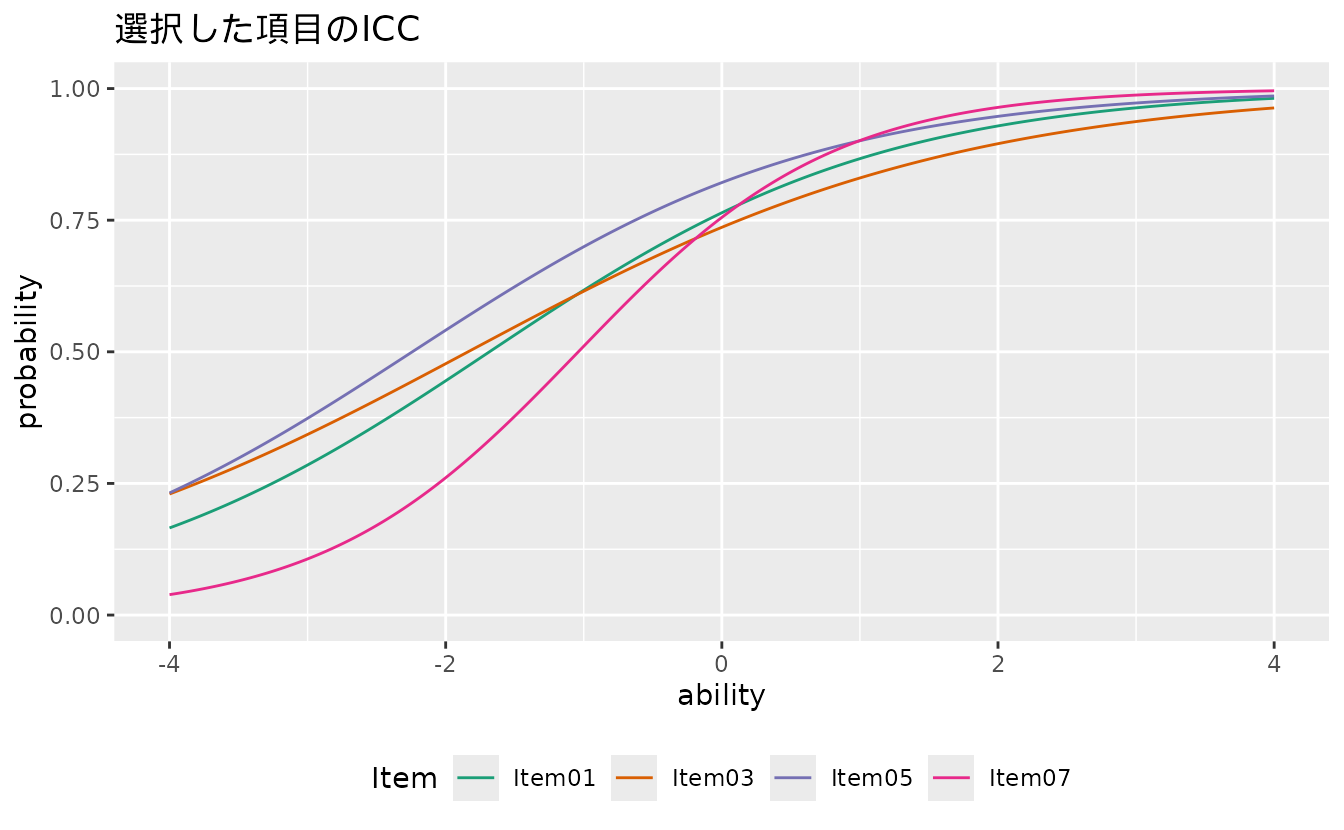 #> iter 11 LogLik -3893.03plotICC_gg: 項目特性曲線(ICC)