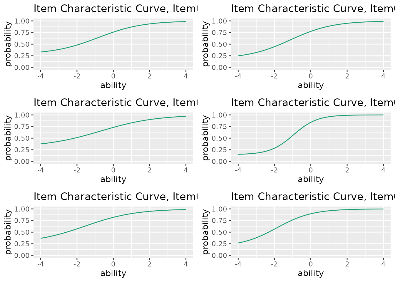 A list of ggplot objects, one for each item. Each plot shows the Item Characteristic Curve for that item.