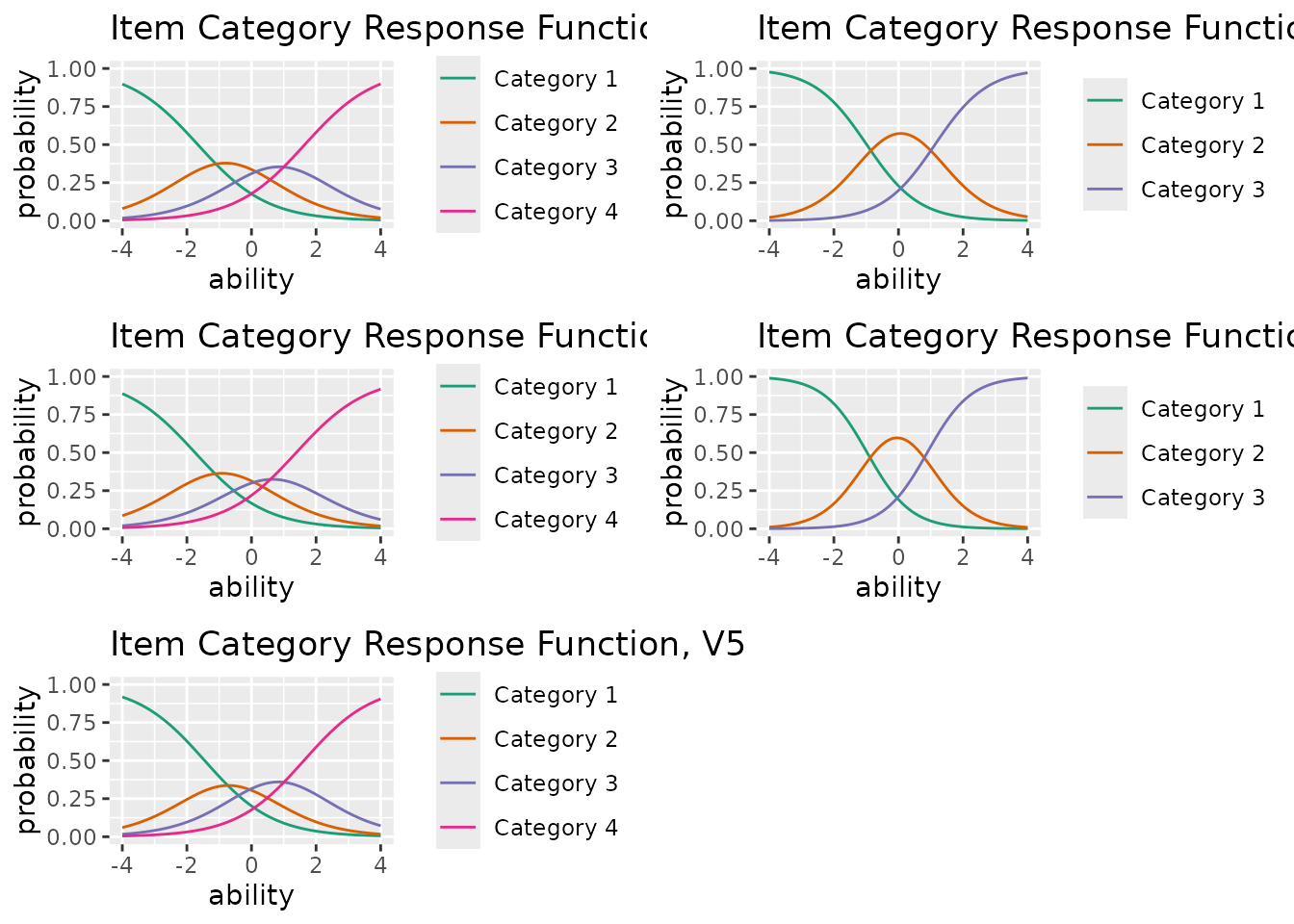 A list of ggplot objects, one for each item. Each plot shows the Item Category Response Function for that item.