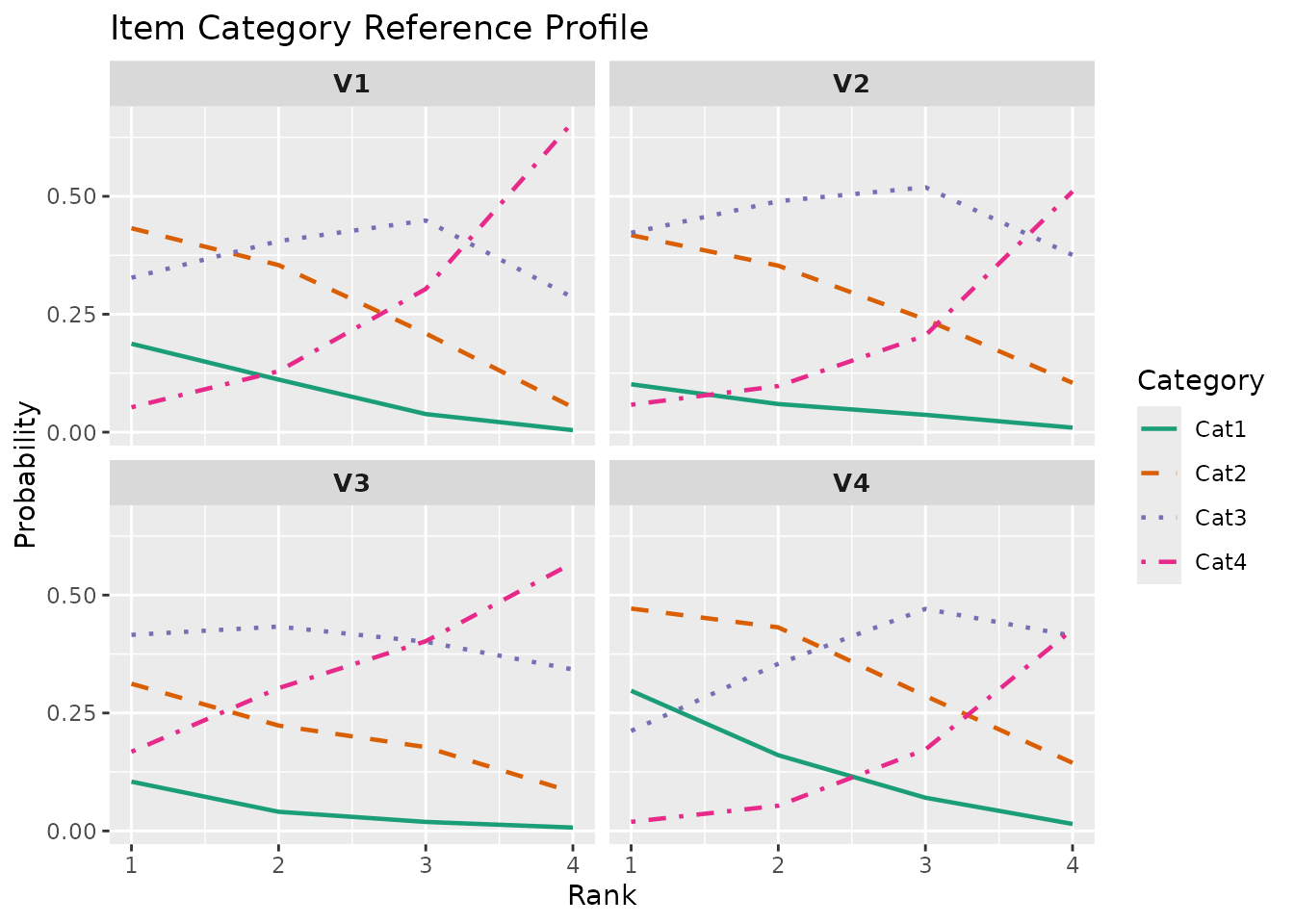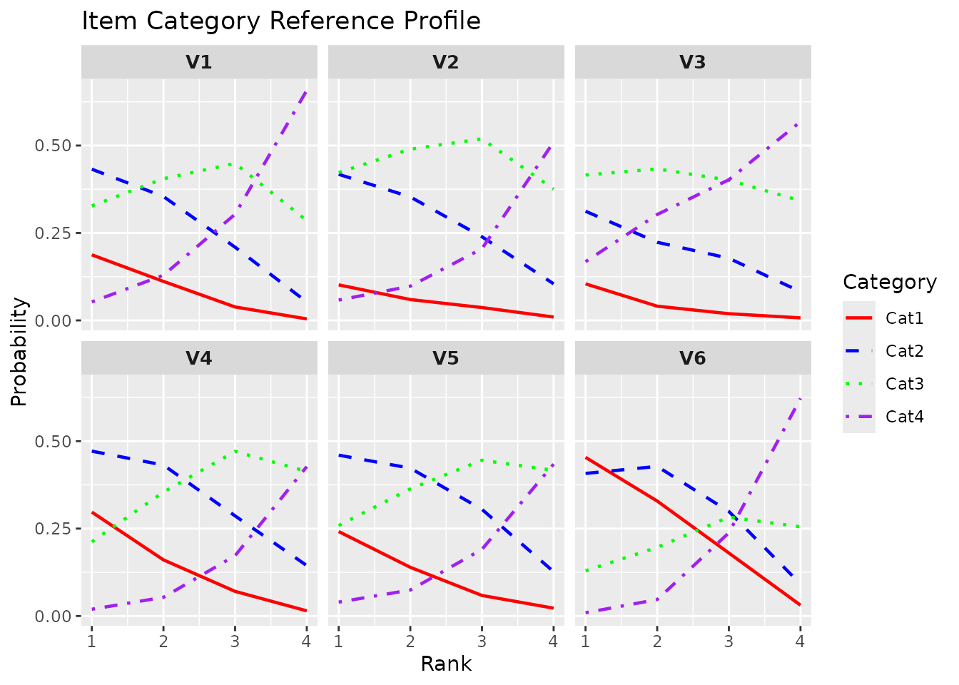 The Item Category Reference Profile (ICRP) visualizes how the response probability for each category changes across latent ranks. Unlike ICBR which shows cumulative probabilities, ICRP shows the raw probability of selecting each specific category.