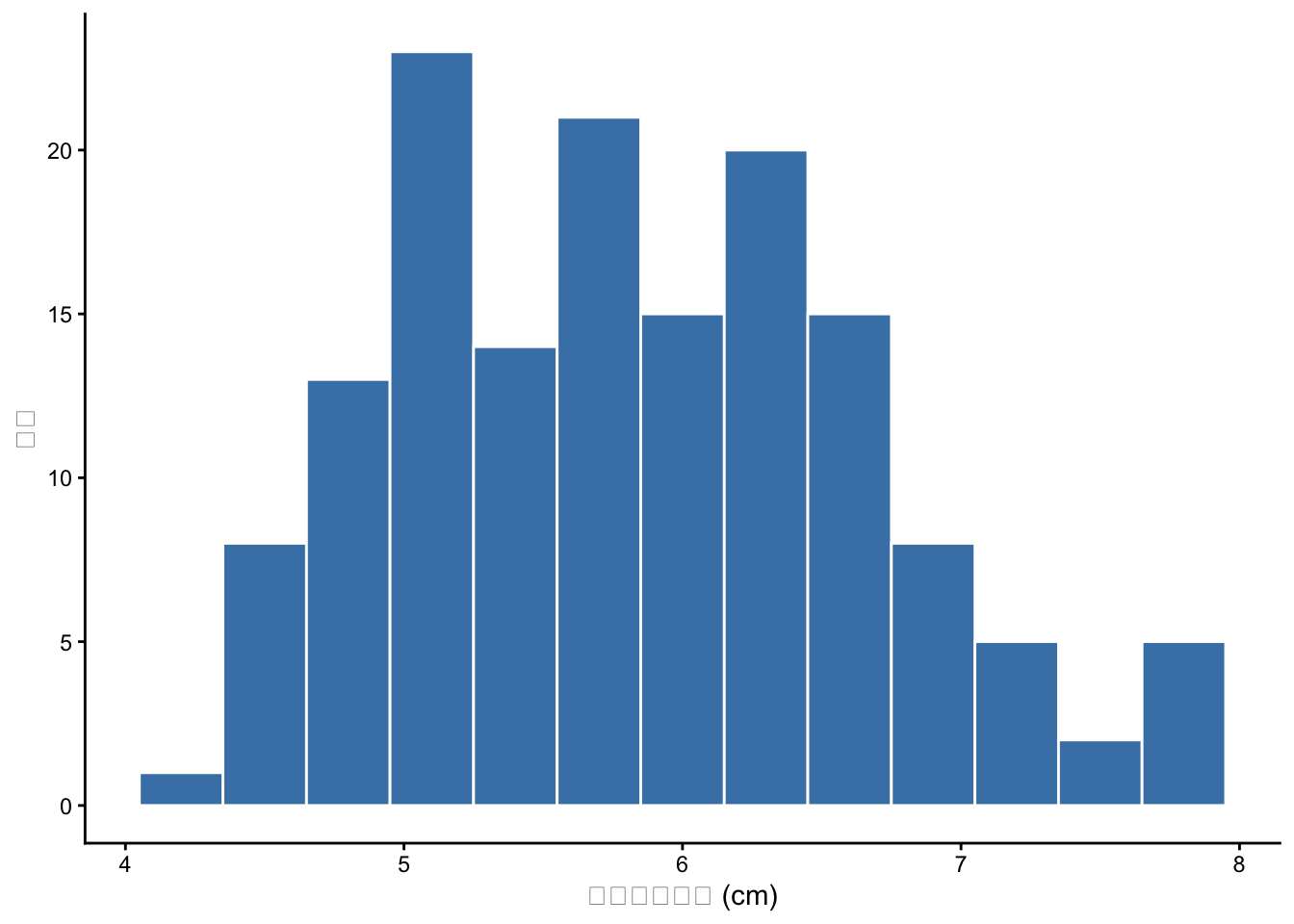 irisデータのSepal.Lengthのヒストグラムを描いてください。ビン幅を0.3に設定し、テーマをtheme_classic()にしてください。