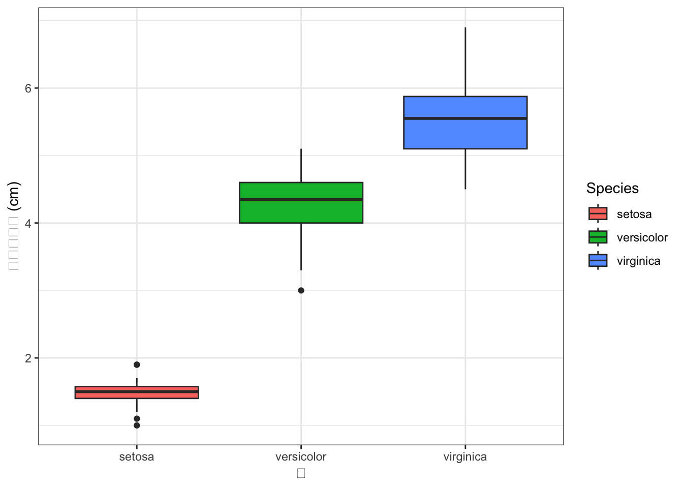 irisデータで、SpeciesごとのPetal.Lengthの分布を箱ひげ図で比較してください。