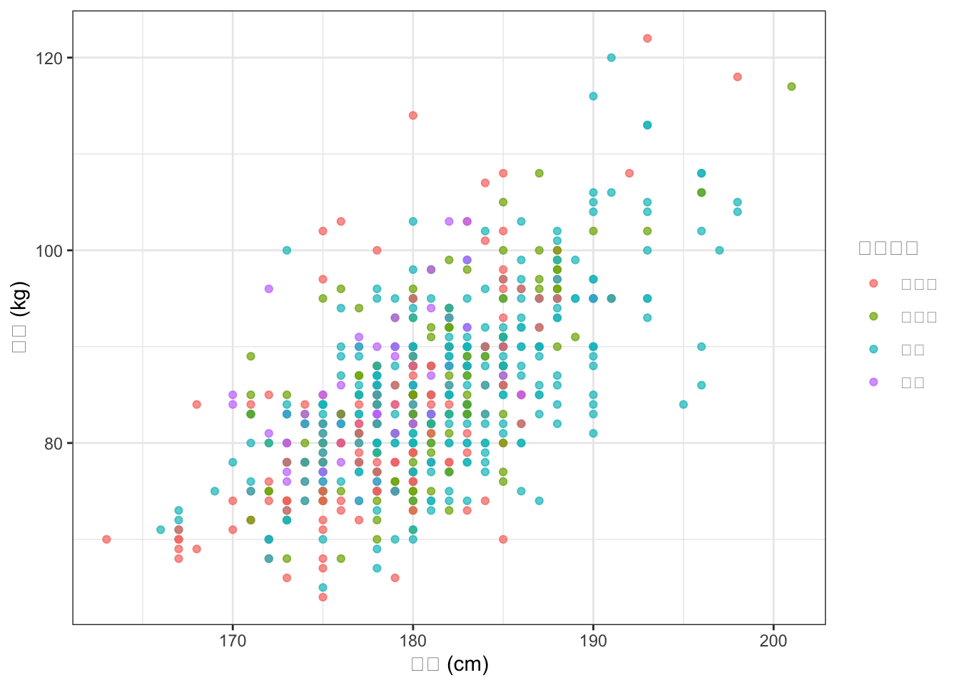 BaseballDecade.csvから2020年度のデータを使い、身長(height)と体重(weight)の散布図を描いてください。守備位置(position)で色分けし、テーマはtheme_bw()にしてください。