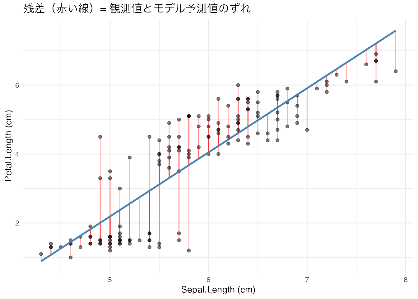 labs(title = "残差(赤い線)= 観測値とモデル予測値のずれ",