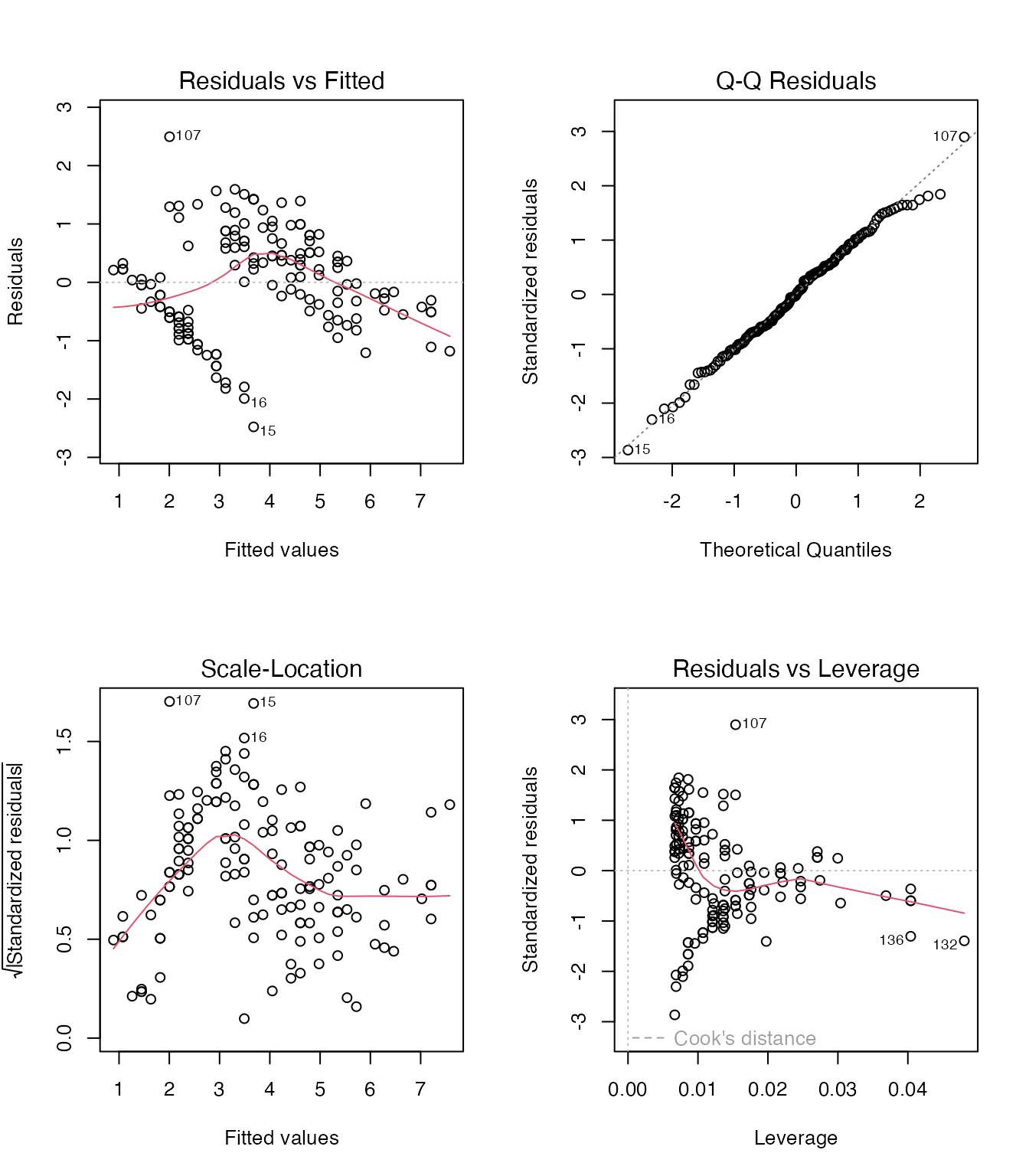- 左上(Residuals vs Fitted): 残差と予測値の関係。パターンがなければOK