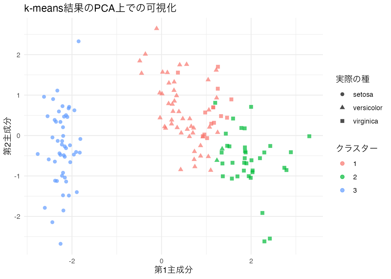 color = "クラスター", shape = "実際の種") +