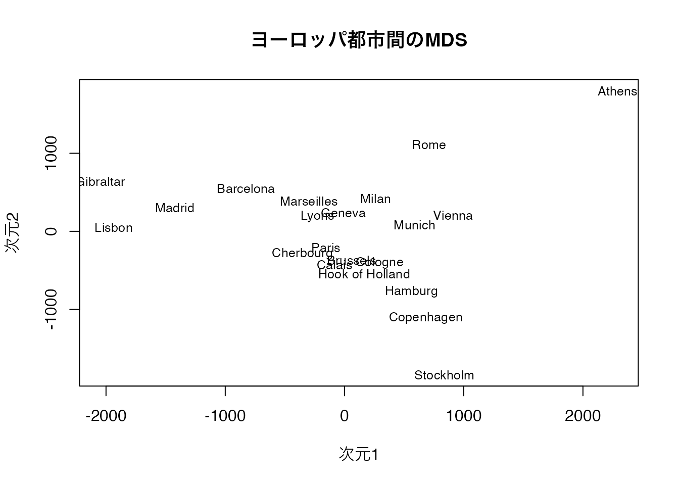 地図のように各都市が配置されていることが確認できます。南北が反転しているように見えるかもしれませんが、MDSの解は回転や鏡映に対して不定であるため、相対的な位置関係が正しく復元されていれば問題ありません。