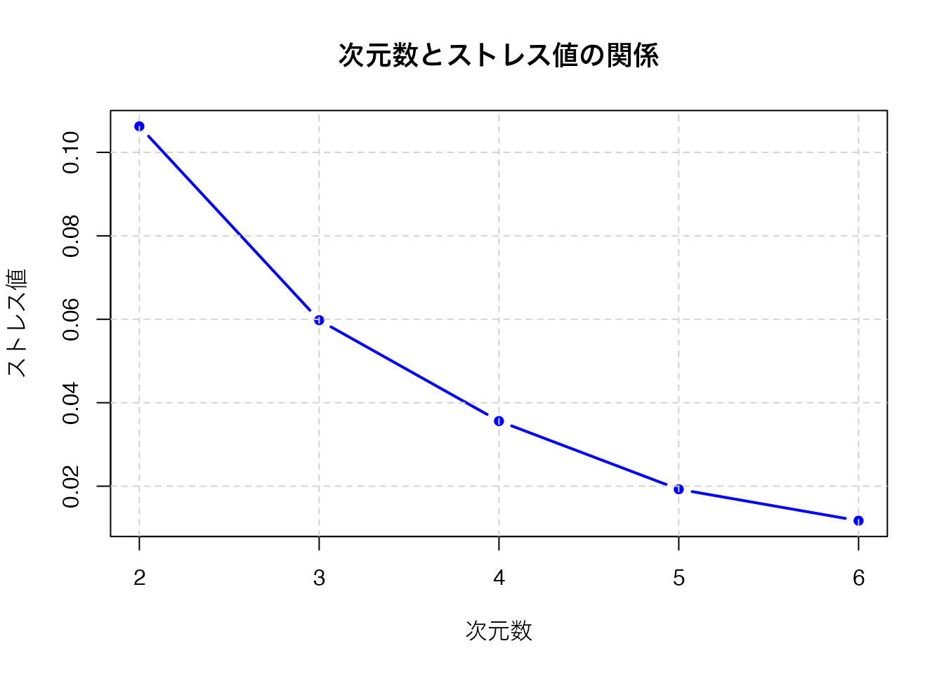 smacof パッケージの mds() 関数で非計量MDSを実行できます。次元数を変えながらストレス値をプロットし、適切な次元数を決定します。スクリープロットと同様に、ストレス値が急減する「肘」を目安にします。