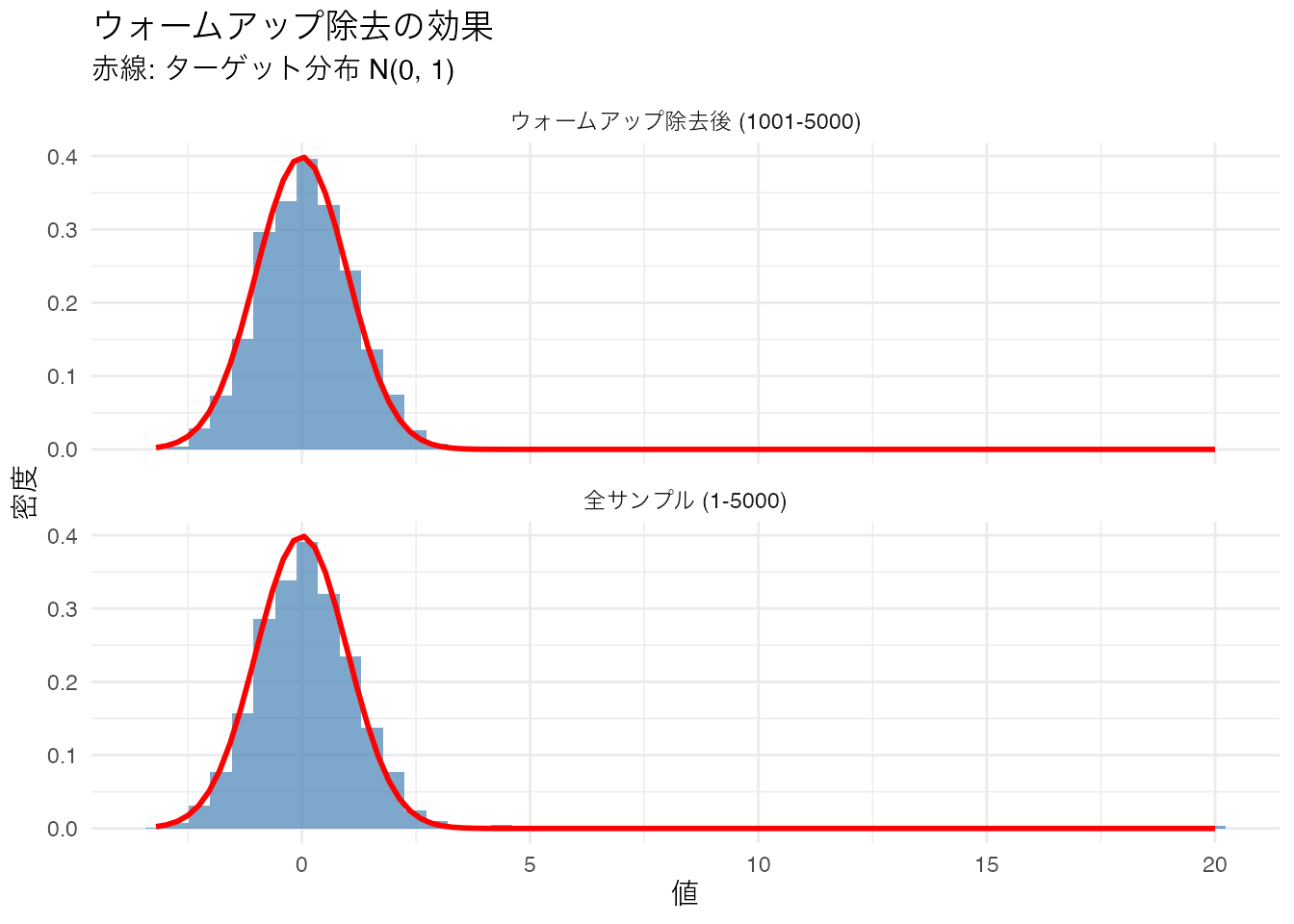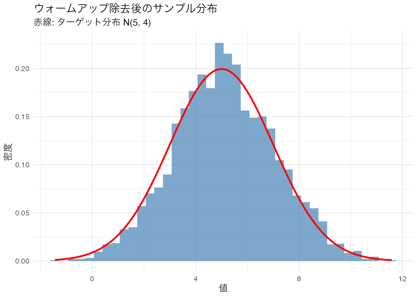 # ウォームアップ除去後のヒストグラムと理論分布の比較