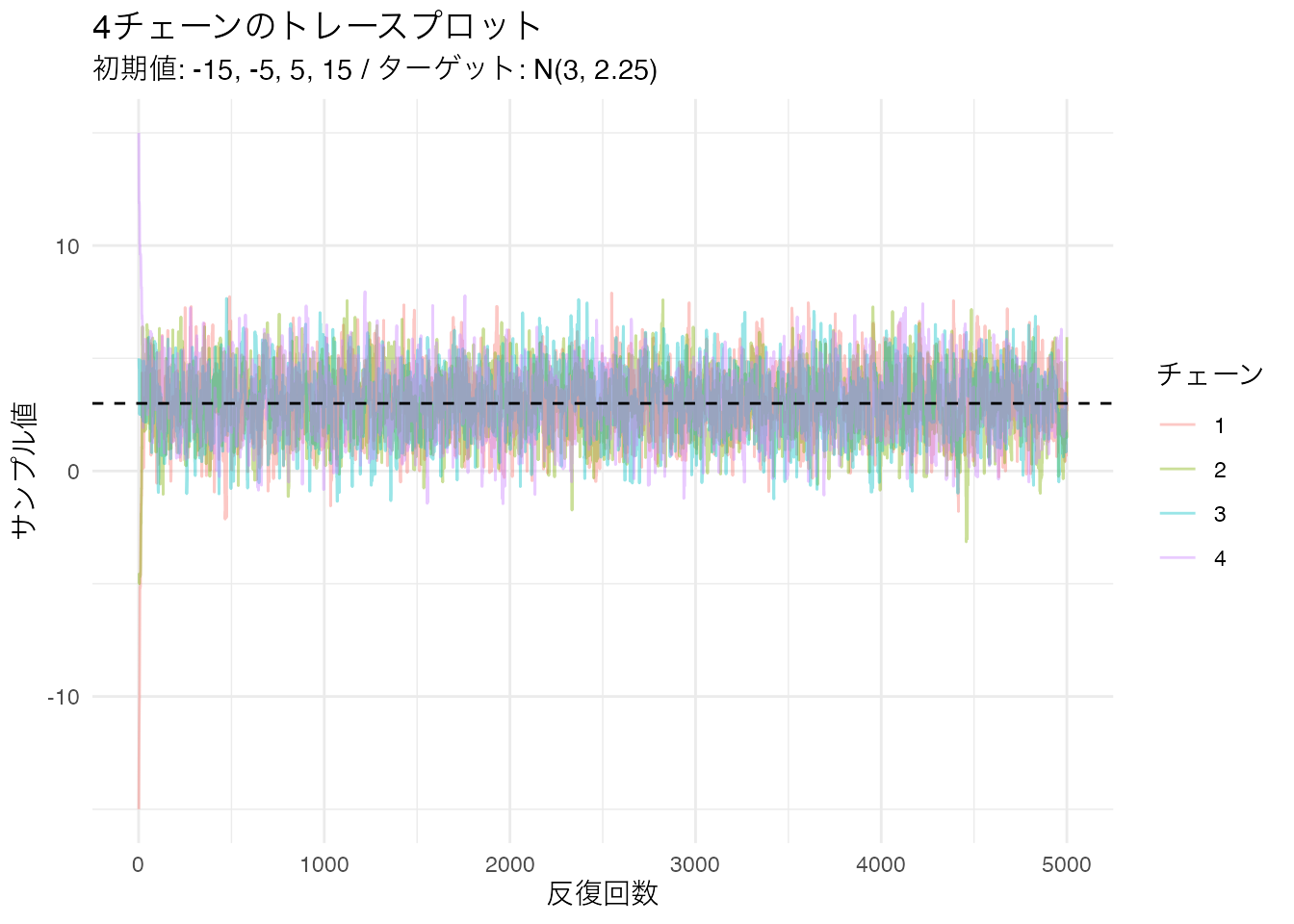 x = "反復回数", y = "サンプル値", color = "チェーン") +