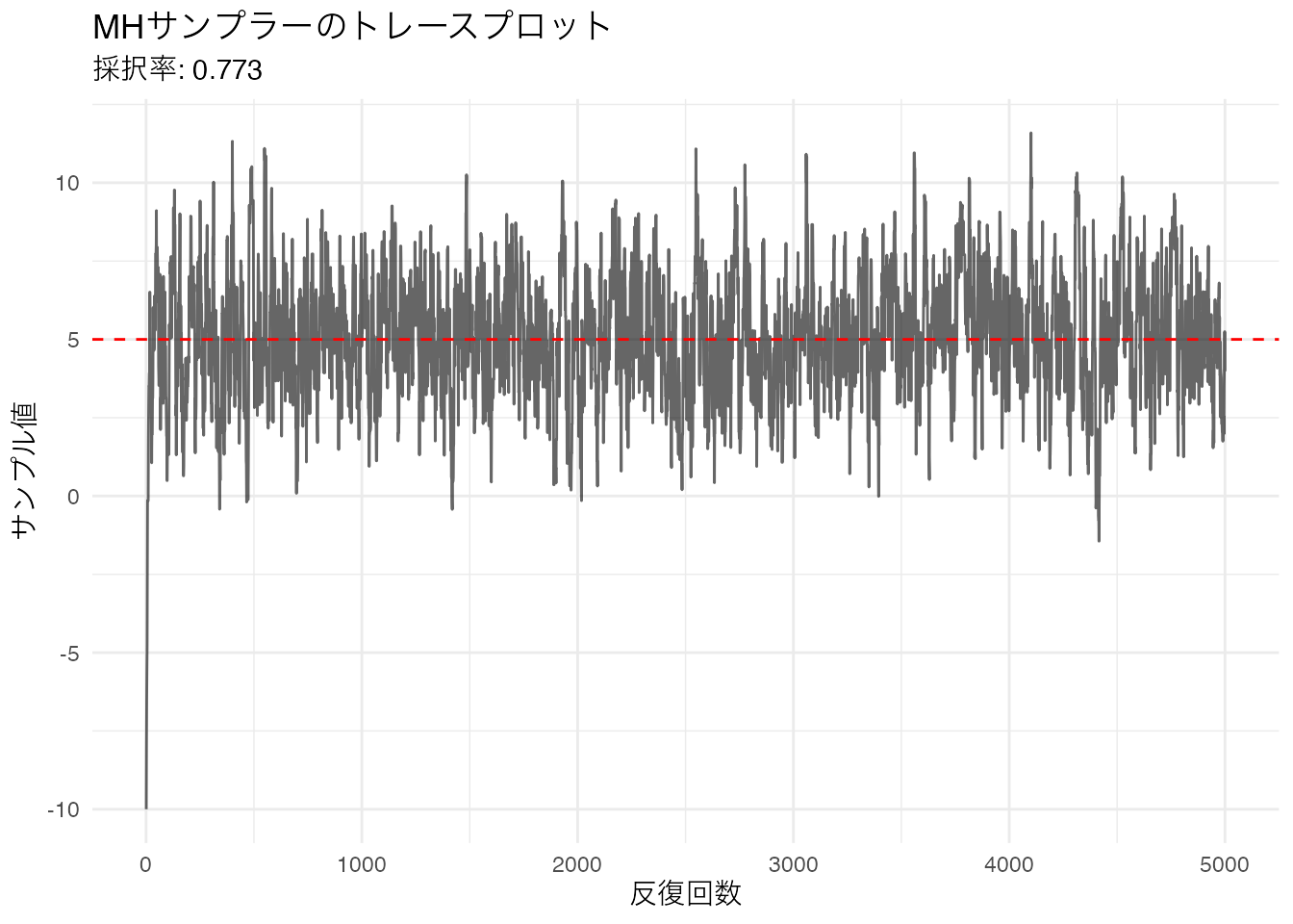 実際に動かしてみましょう。ターゲット分布を \(N(5, 2^2)\) として、初期値を \(-10\) から始めます。