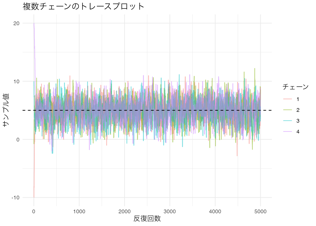初期値 \(-10\) から始まっているため、最初の数百回は真の値(赤い破線)に到達するまでの過渡期になっています。この部分を ウォームアップ(warm-up) または バーンイン(burn-in) と呼びます。