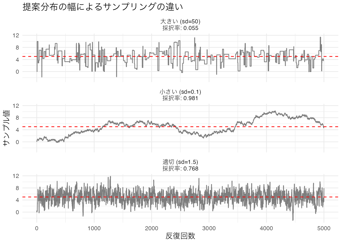 - 提案分布の幅 はサンプリング効率に大きく影響し、採択率20–50%が目安である