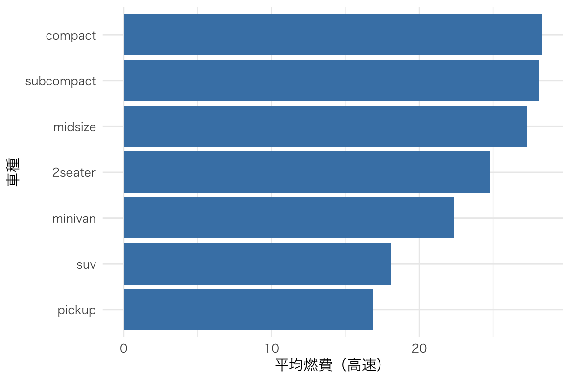 mpg |>group_by(class) |>summarize(mean_hwy =mean(hwy)) |>ggplot(aes(x =reorder(class, mean_hwy), y = mean_hwy)) +geom_col(fill ="steelblue") +labs(x ="車種", y ="平均燃費(高速)") +coord_flip()