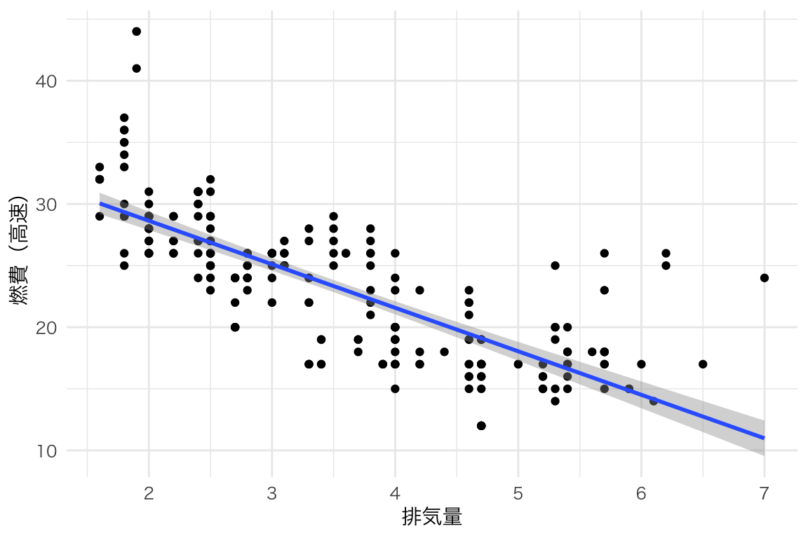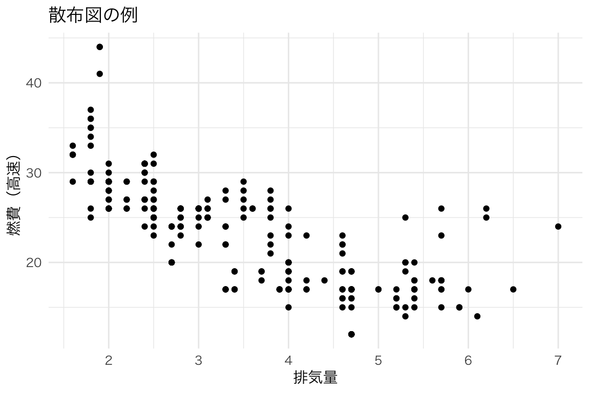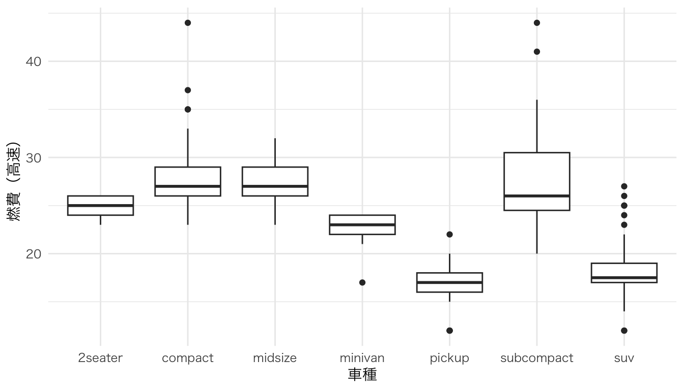 ggplot(mpg, aes(x = class, y = hwy)) +geom_boxplot() +labs(x ="車種", y ="燃費(高速)")