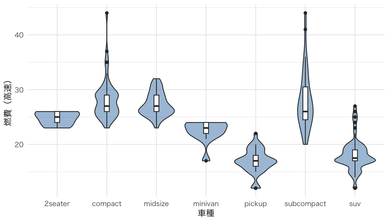 ggplot(mpg, aes(x = class, y = hwy)) +geom_violin(fill ="steelblue", alpha =0.5) +geom_boxplot(width =0.1) +labs(x ="車種", y ="燃費(高速)")