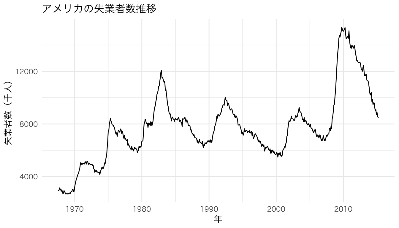 economics |>ggplot(aes(x = date, y = unemploy)) +geom_line() +labs(x ="年", y ="失業者数(千人)", title ="アメリカの失業者数推移")