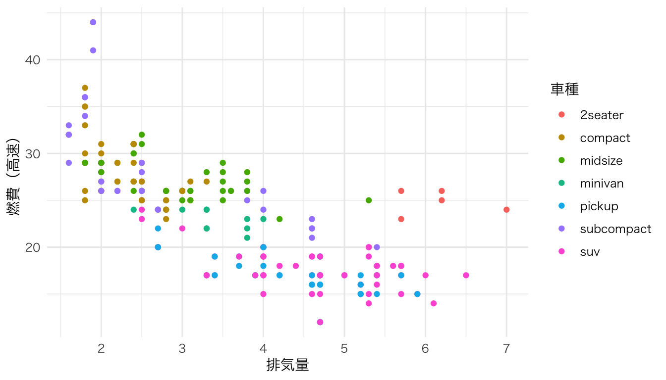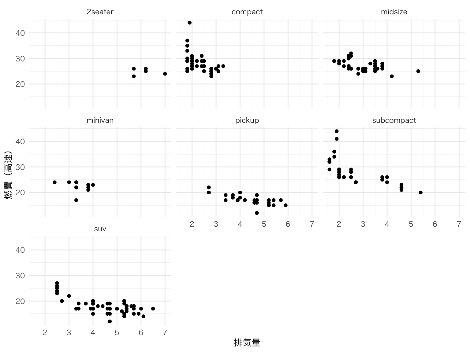 ggplot(mpg, aes(x = displ, y = hwy)) +geom_point() +facet_wrap(~ class) +labs(x ="排気量", y ="燃費(高速)")