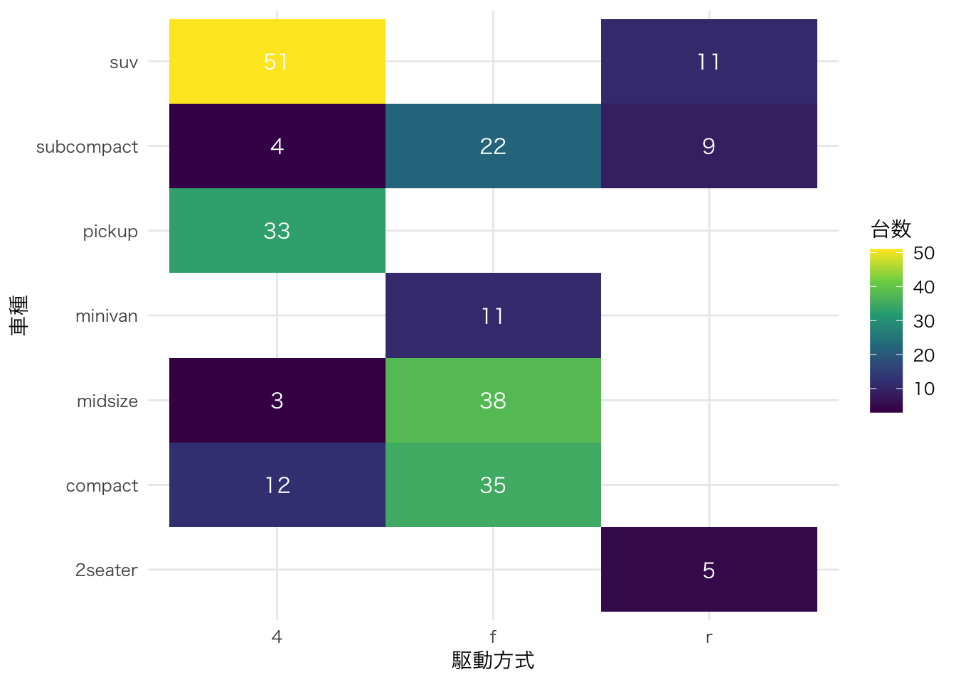 mpg |>count(class, drv) |>ggplot(aes(x = drv, y = class, fill = n)) +geom_tile() +geom_text(aes(label = n), color ="white") +scale_fill_viridis_c() +labs(x ="駆動方式", y ="車種", fill ="台数")