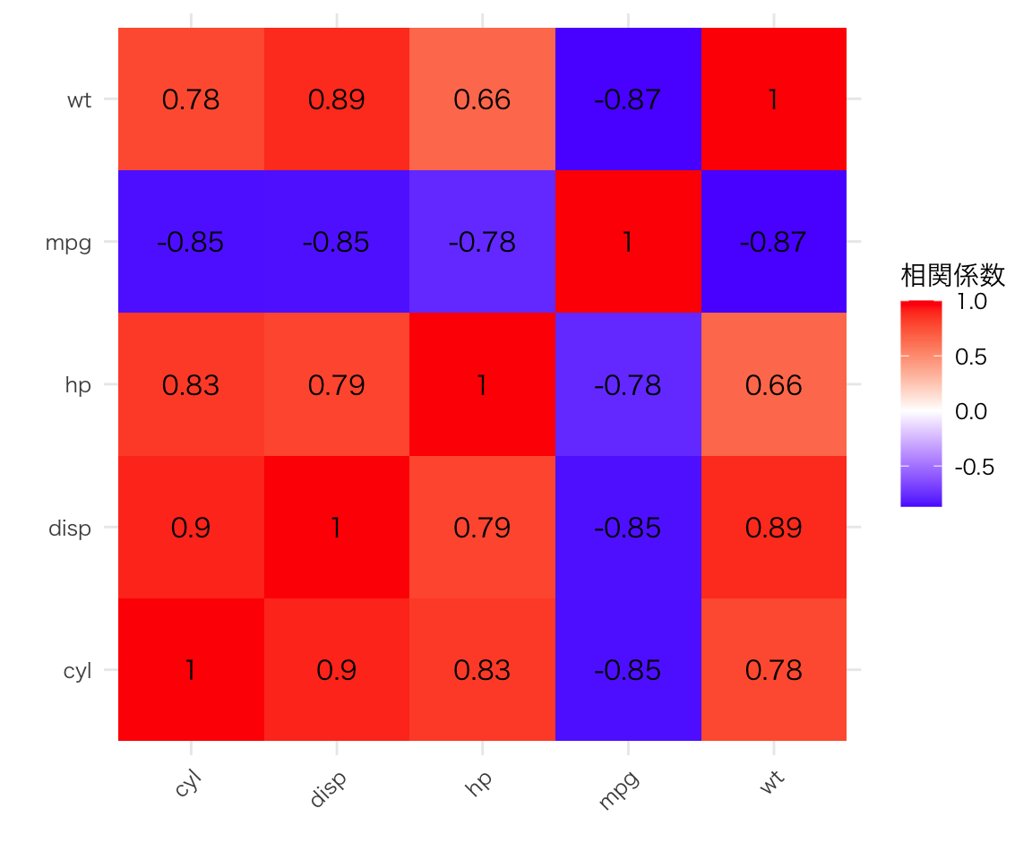 mtcars |>select(mpg, cyl, disp, hp, wt) |>cor() |>as.data.frame() |>rownames_to_column("var1") |>pivot_longer(-var1, names_to ="var2", values_to ="cor") |>ggplot(aes(x = var1, y = var2, fill = cor)) +geom_tile() +geom_text(aes(label =round(cor, 2))) +scale_fill_gradient2(low ="blue", mid ="white", high ="red", midpoint =0) +labs(x ="", y ="", fill ="相関係数") +theme(axis.text.x =element_text(angle =45, hjust =1))