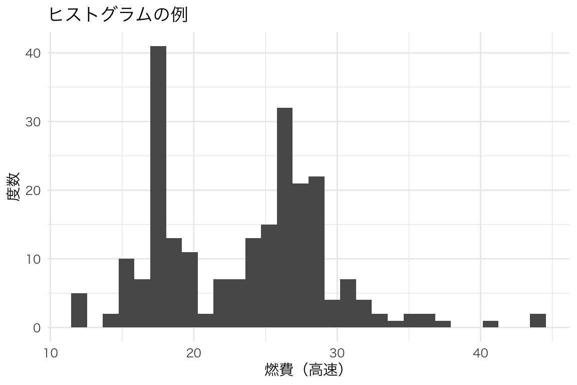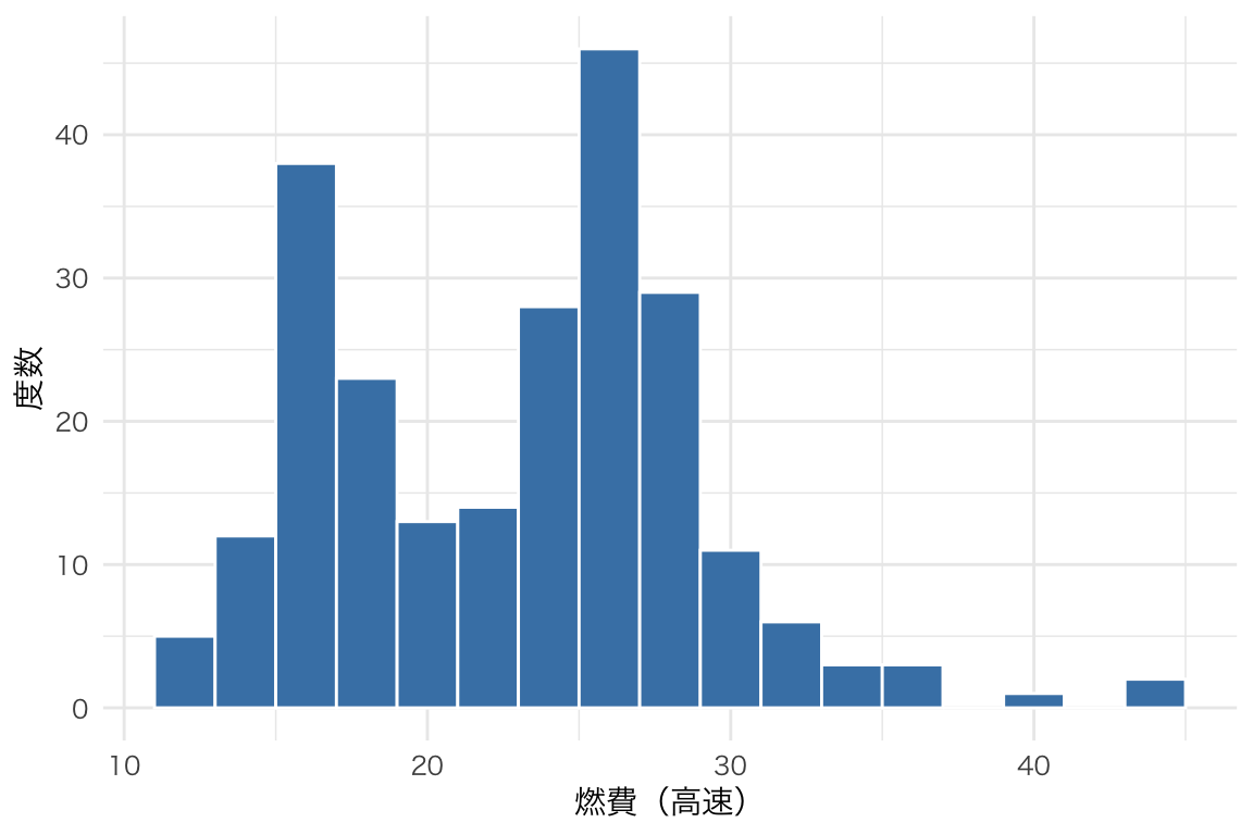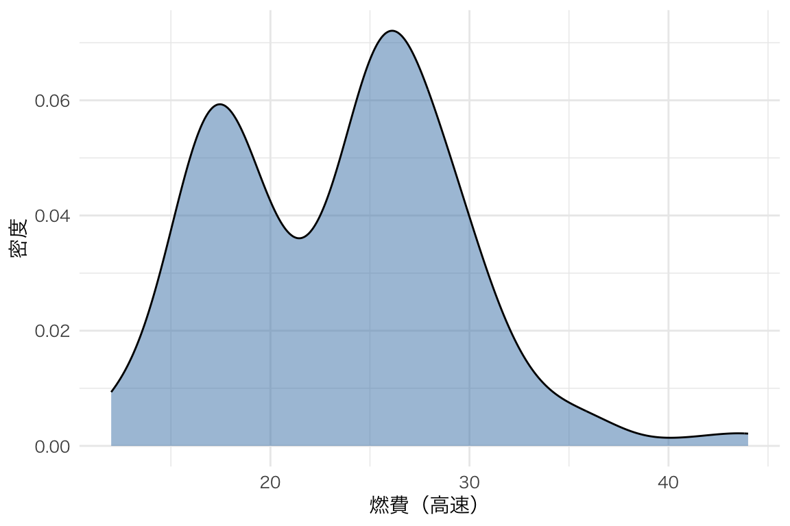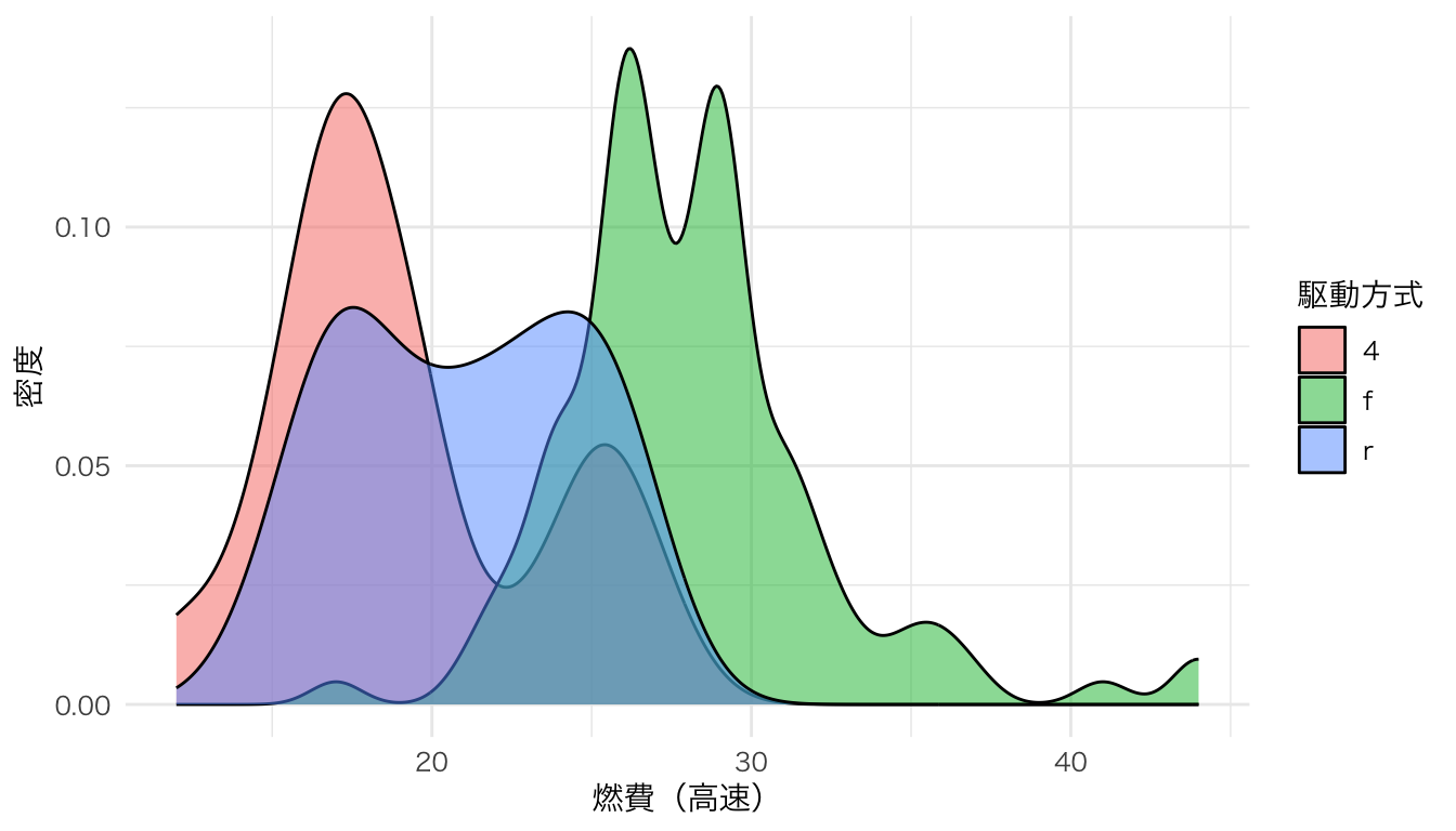 ggplot(mpg, aes(x = hwy, fill = drv)) +geom_density(alpha =0.5) +labs(x ="燃費(高速)", y ="密度", fill ="駆動方式")