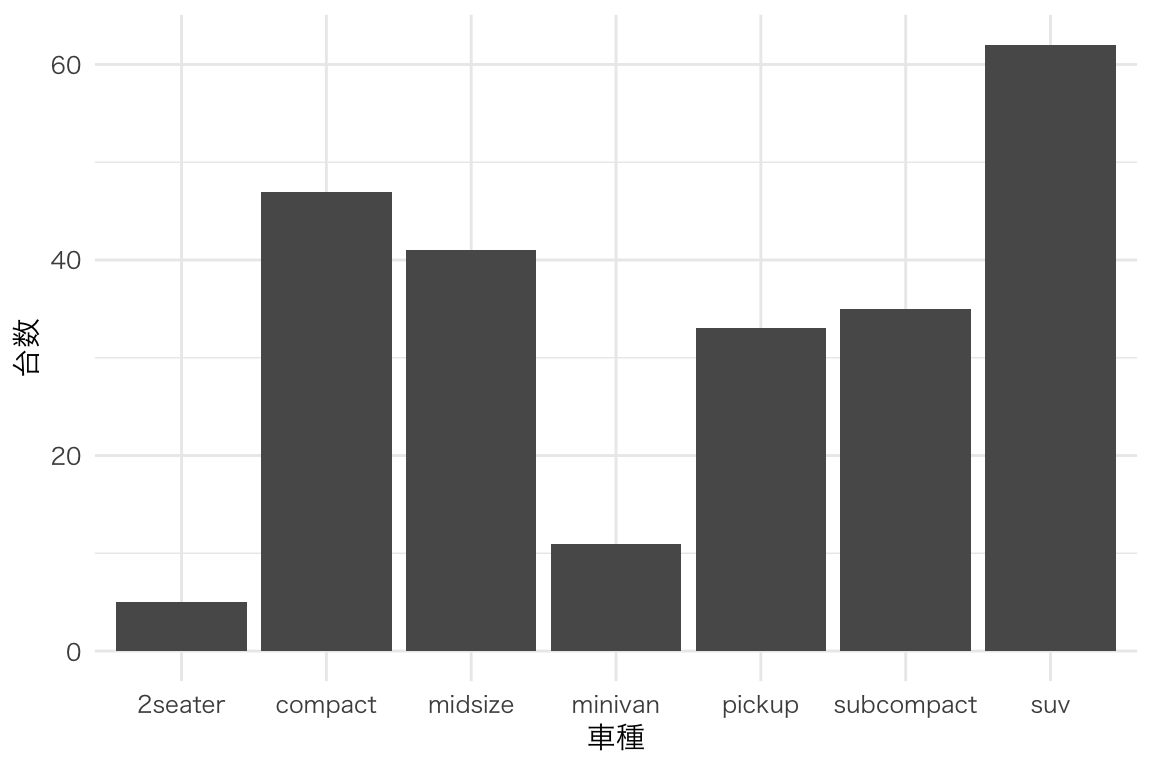 ggplot(mpg, aes(x = class)) +geom_bar() +labs(x ="車種", y ="台数")